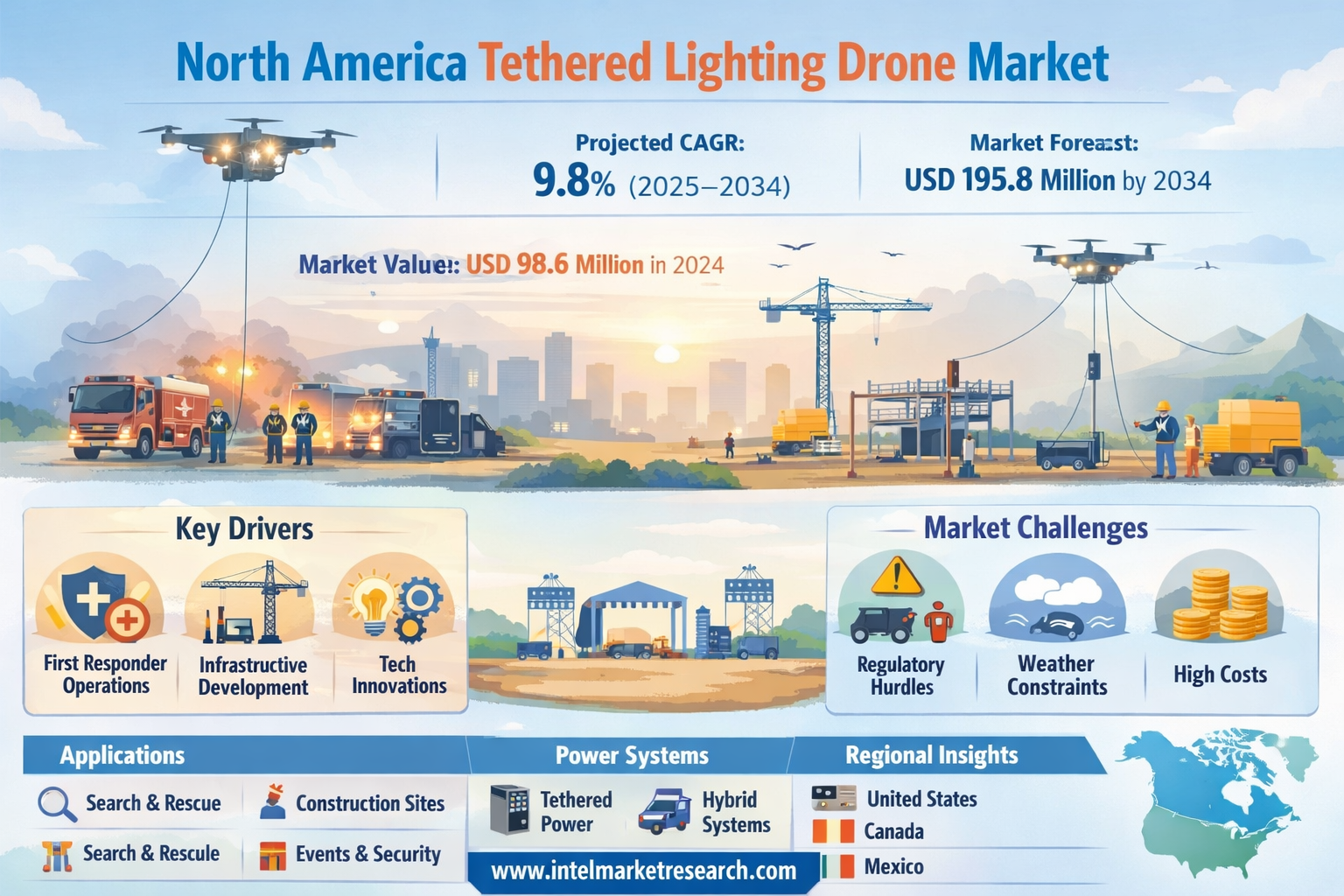According to a new report from Intel Market Research, the North America Tethered Lighting Drone Market was valued at USD 98.6 million in 2024 and is projected to grow from USD 108.5 million in 2025 to USD 195.8 million by 2034, exhibiting a robust CAGR of 9.8% during the forecast period (2025–2034). This growth is driven by heightened adoption across public safety agencies, accelerating infrastructure development, and continuous innovation in tethered UAV power and stabilization technologies.