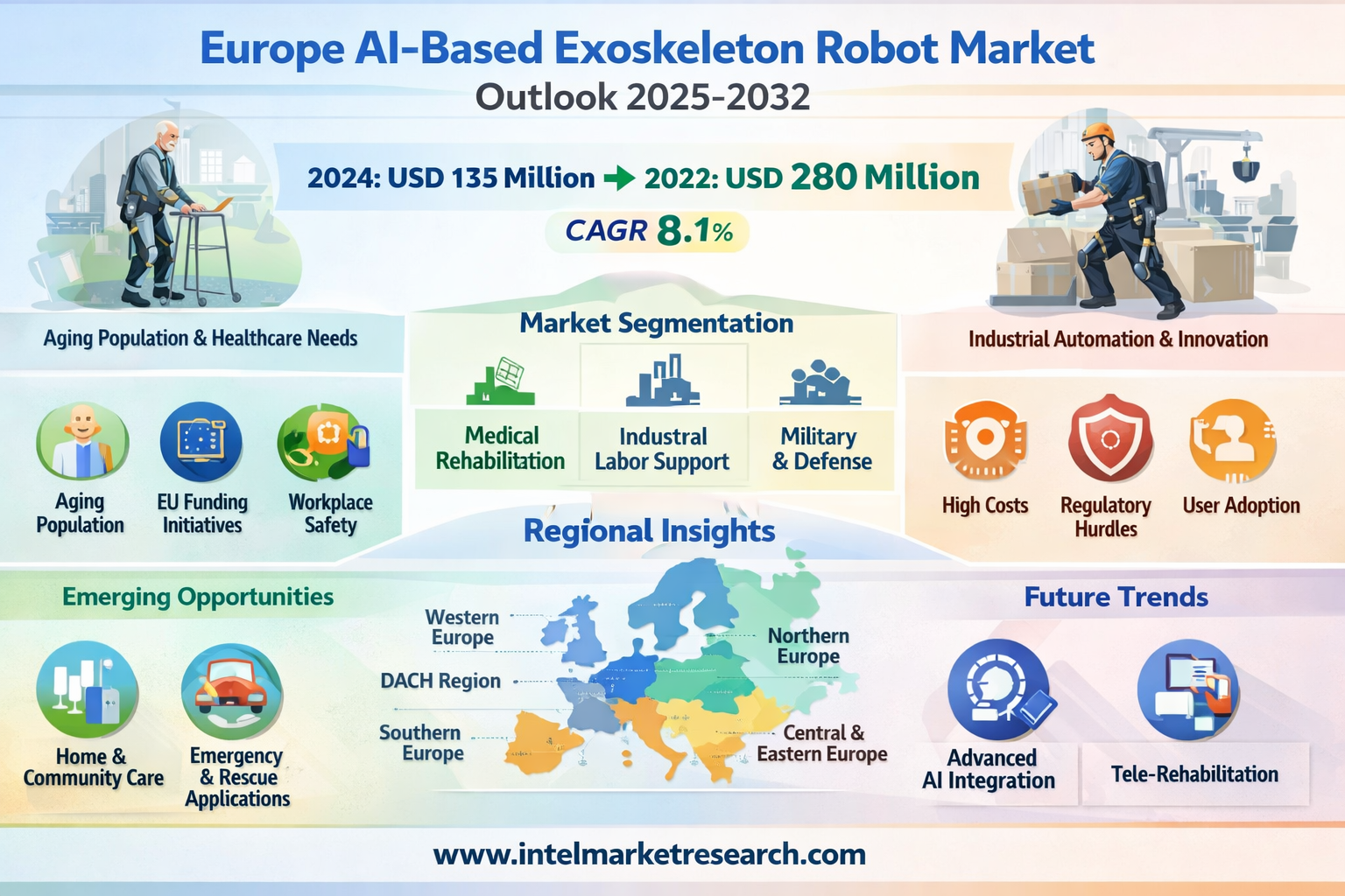 According to a new report from Intel Market Research, the Europe AI-based Exoskeleton Robot Market was valued at USD 135 million in 2024 and is projected to grow from USD 150 million in 2025 to USD 280 million by 2032, exhibiting a robust CAGR of 8.1% during the forecast period (2025–2032). This growth is propelled by the region's rapidly aging population, an intensifying focus on industrial automation, and substantial public and private investment in robotics research under landmark initiatives such as the EU's Horizon Europe program.