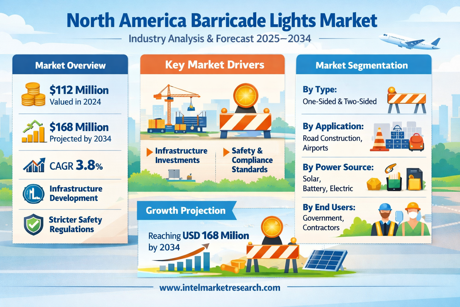 According to a new report from Intel Market Research, the North America Barricade Lights market was valued at USD 112 million in 2024 and is projected to reach USD 168 million by 2034, growing at a CAGR of 3.8% during the forecast period (2025–2034). This growth is propelled by increasing infrastructure development projects across the region and stricter government regulations regarding worksite safety standards.