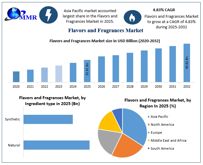The global Flavors and Fragrances Market continues to demonstrate robust growth, fueled by evolving consumer preferences, increasing demand for convenience foods, and rapid expansion across personal care and pharmaceutical sectors. The market was valued at USD 35.81 billion in 2025 and is projected to grow at a CAGR of 4.83% from 2025 to 2032, reaching approximately USD 49.82 billion by 2032.