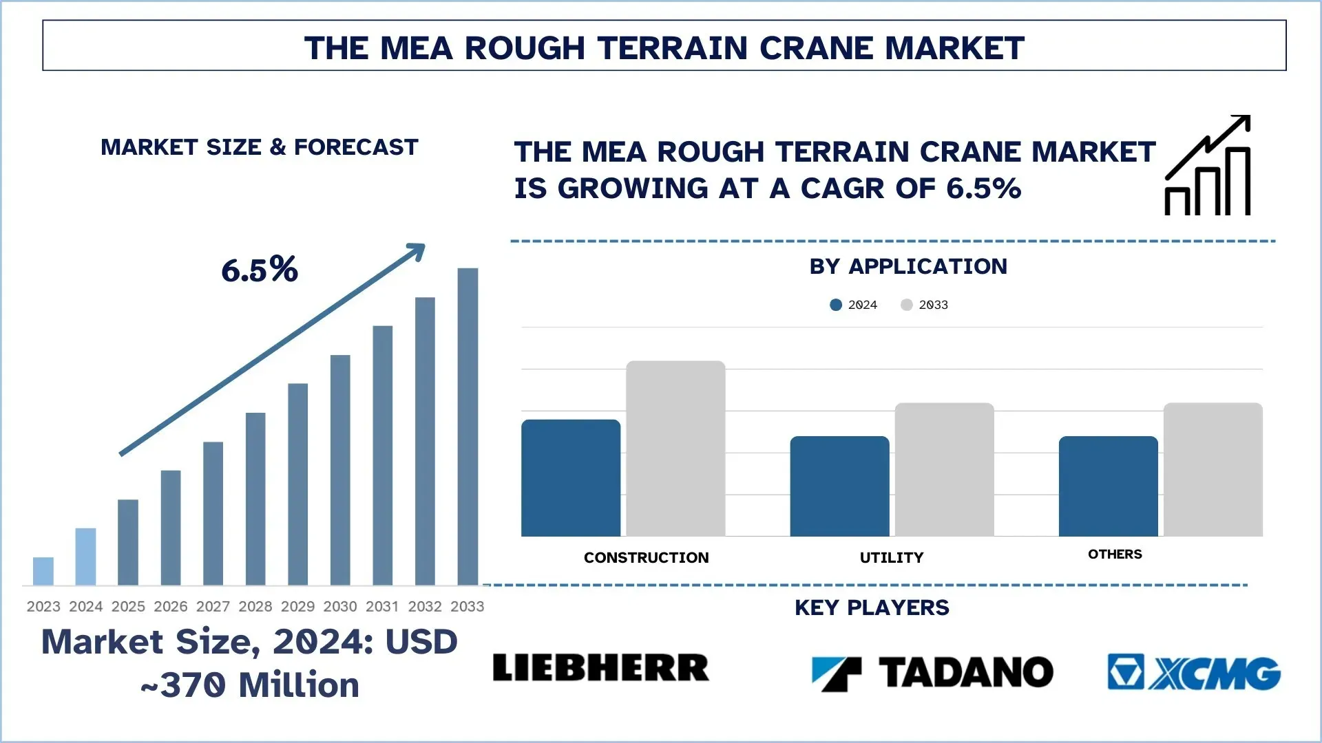 According to UnivDatos, Infrastructure and Construction Growth, and Oil & Gas Sector Investments are some of the key factors that have supported the need for the rough terrain crane market in the Middle East & Africa. As per their “Middle East & Africa Rough Terrain Crane Market” report, the Middle East & Africa market was valued at USD 370 million in 2024, growing at a CAGR of about 6.50% during the forecast period from 2025 - 2033 to reach USD million by 2033.