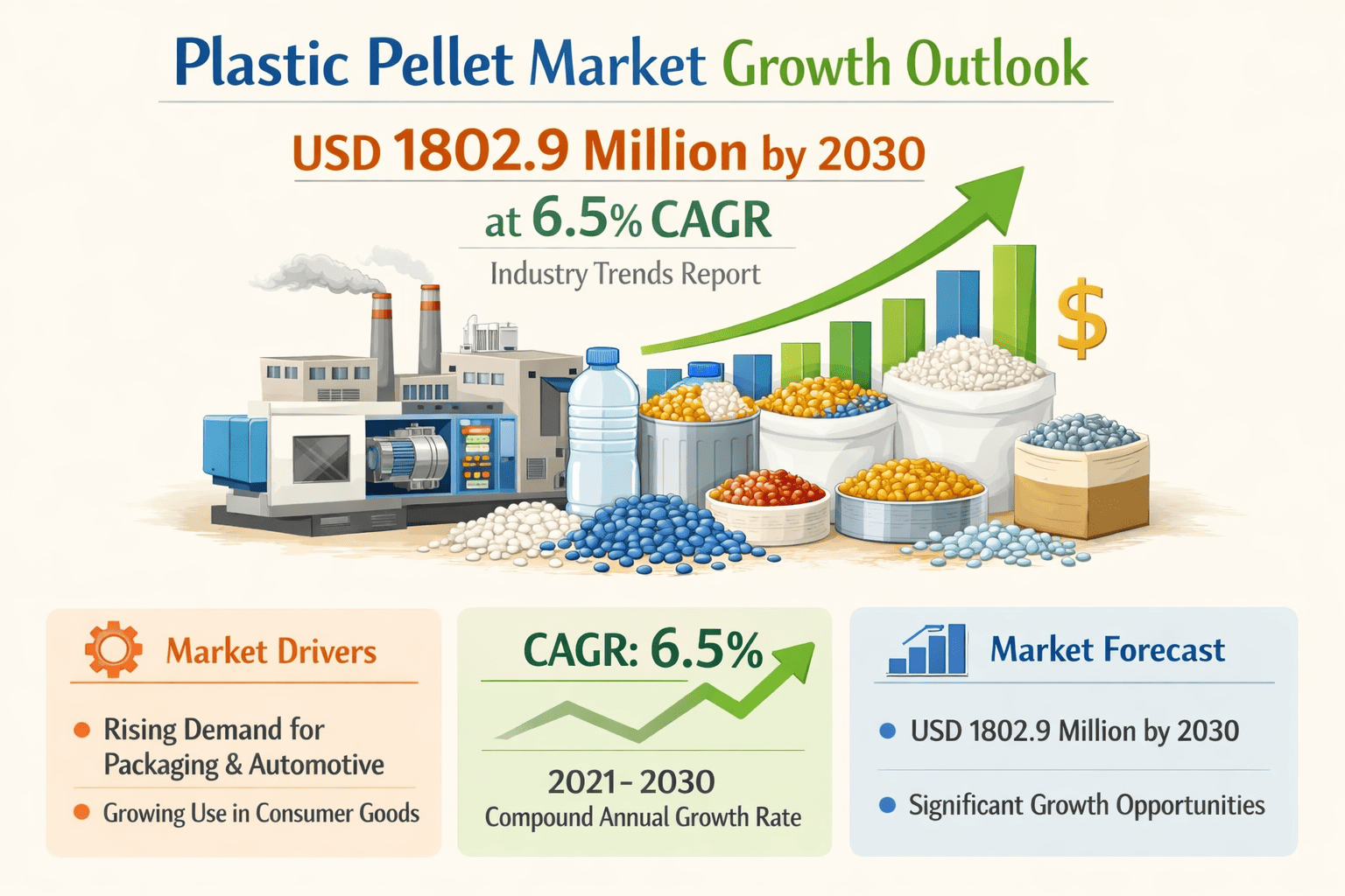 Plastic Pellet Market Growth Outlook: USD 1802.9 Million by 2030 at 6.5% CAGR Industry Trends Report