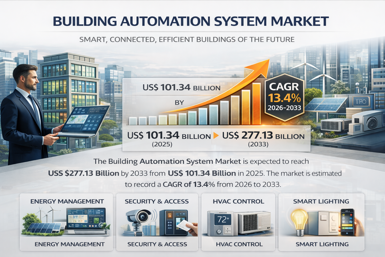The Building Automation System Market is expected to reach US$ 277.13 Billion by 2033 from US$ 101.34 Billion in 2025. The market is estimated to record a CAGR of 13.4% from 2026 to 2033. This robust growth trajectory is fueled by stringent government regulations regarding carbon emissions and the increasing demand for "green buildings" that reduce operational costs while enhancing occupant comfort.
