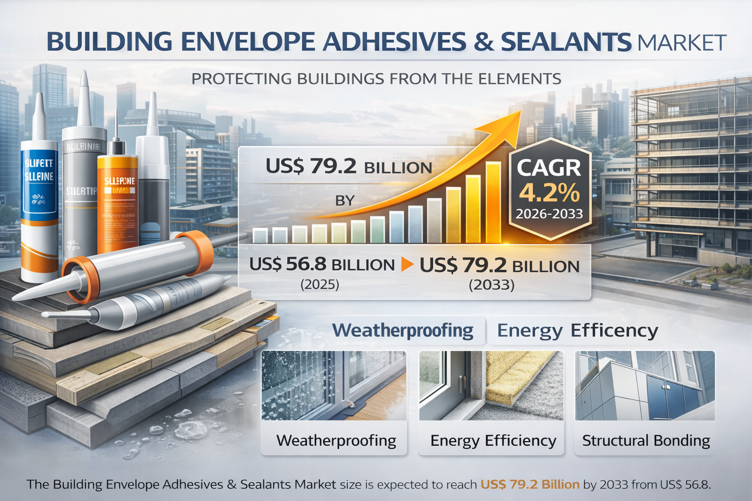 The financial trajectory of this sector reflects the broader recovery and expansion of the global construction market. According to recent industry analysis,the Building Envelope Adhesives & Sealants Market size is expected to reach US$ 79.2 billion by 2033 from US$ 56.8 billion in 2025. The market is estimated to record a CAGR of 4.2% from 2026 to 2033.