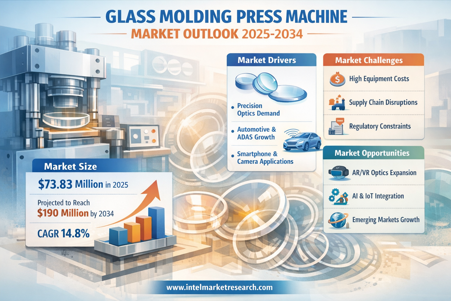 According to a new report from Intel Market Research, the global Glass Molding Press Machine market was valued at USD 73.83 million in 2025 and is projected to reach USD 190 million by 2034, growing at a robust CAGR of 14.8% during the forecast period (2026–2034). This growth is propelled by rising demand across key application segments including automotive, security, and smartphones, the growing adoption of advanced driver-assistance systems (ADAS) and heads-up display (HUD) technologies, and the proliferation of high-resolution camera modules in consumer electronics.