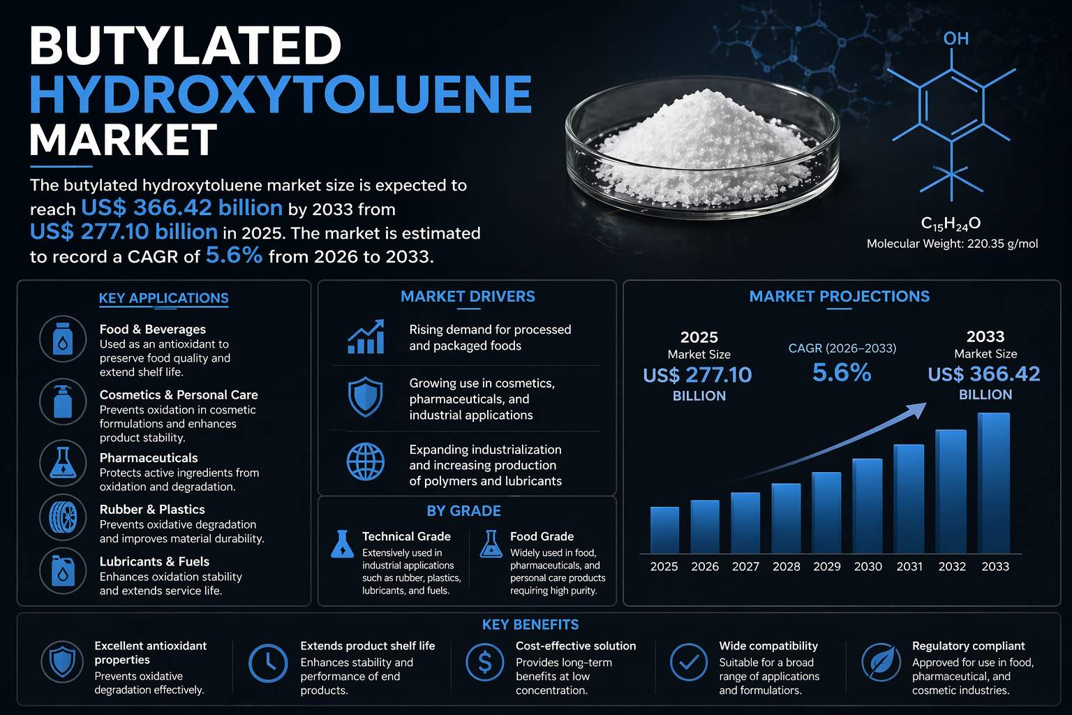 The financial trajectory of this industry reflects a steady and robust expansion. The Butylated Hydroxytoluene Market size is expected to reach US$ 366.42 billion by 2033 from US$ 277.10 billion in 2025. The market is estimated to record a CAGR of 5.6% from 2026 to 2033. This growth is underpinned by the increasing consumption of vegetable oils, processed meats, and snack foods, where BHT serves as a vital additive to prevent rancidity. Additionally, the flourishing automotive and aerospace sectors require BHT for the stabilization of fuels and lubricants, ensuring engine efficiency and longevity.