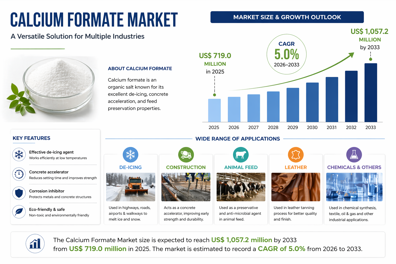 The Calcium Formate Market size is expected to reach US$ 1,057.2 million by 2033 from US$ 719.0 million in 2025. The market is estimated to record a CAGR of 5.0% from 2026 to 2033.