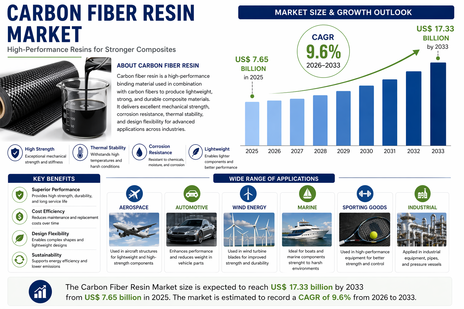 The Carbon Fiber Resin Market size is expected to reach US$ 17.33 billion by 2033 from US$ 7.65 billion in 2025. The market is estimated to record a CAGR of 9.6% from 2026 to 2033.