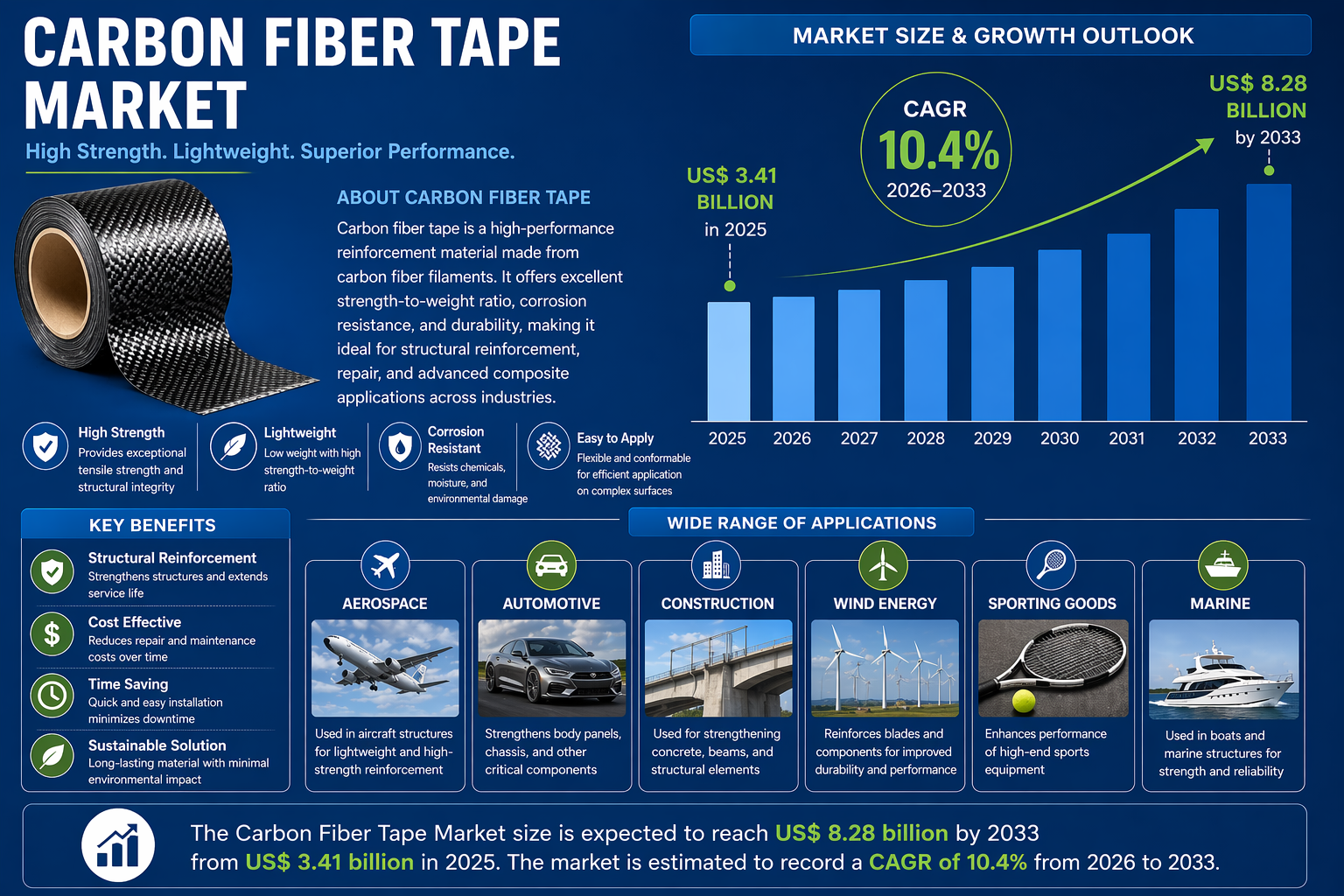 Carbon Fiber Tape Market Size to Reach US$ 8.28 Billion by 2033 at 10.4% CAGR: Industry Trends, Growth Analysis & Outlook
