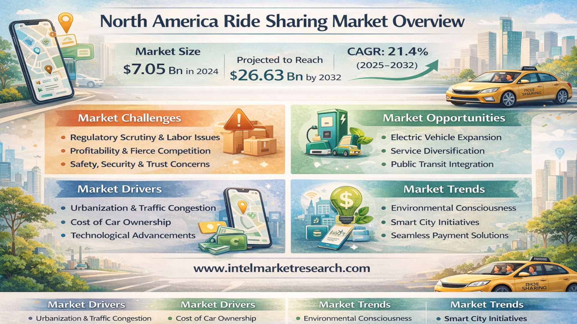 According to a new report from Intel Market Research, the North America Ride Sharing Market was valued at USD 7.05 billion in 2024 and is projected to reach USD 26.63 billion by 2032, growing at a robust CAGR of 21.4% during the forecast period (2025–2032). This growth is propelled by increasing urbanization, the rising cost of personal vehicle ownership and maintenance, growing environmental consciousness among consumers, and advancements in mobile technology, GPS navigation, and secure payment gateways.