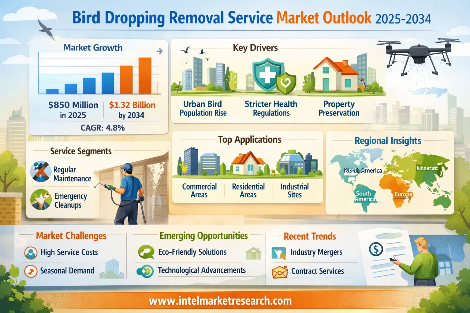 According to a new report from Intel Market Research, the global Bird Dropping Removal Service market was valued at USD 850 million in 2025 and is projected to reach USD 1.32 billion by 2034, growing at a CAGR of 4.8% during the forecast period (2026–2034). This growth is propelled by increasing urban bird populations, stricter public health regulations regarding biohazard cleanup, and rising awareness of property preservation.