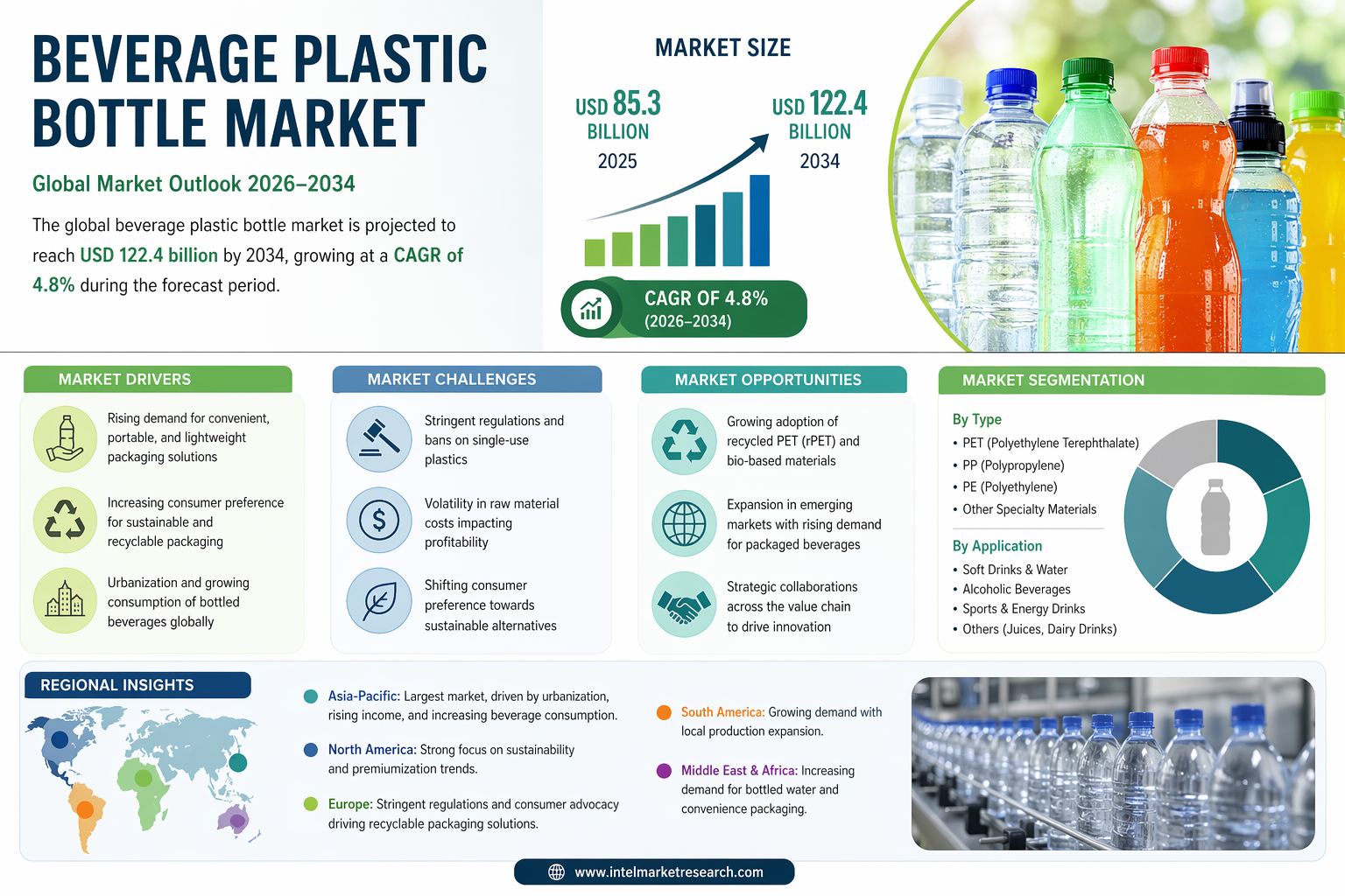 According to a new report from Intel Market Research, the global Beverage Plastic Bottle market was valued at USD 85.3 billion in 2025 and is projected to reach USD 122.4 billion by 2034, growing at a robust CAGR of 4.8% during the forecast period (2026–2034). This growth is propelled by the increasing demand for convenient, portable packaging solutions, urbanization trends, rising consumption of bottled beverages globally, and innovations in sustainable packaging technologies.