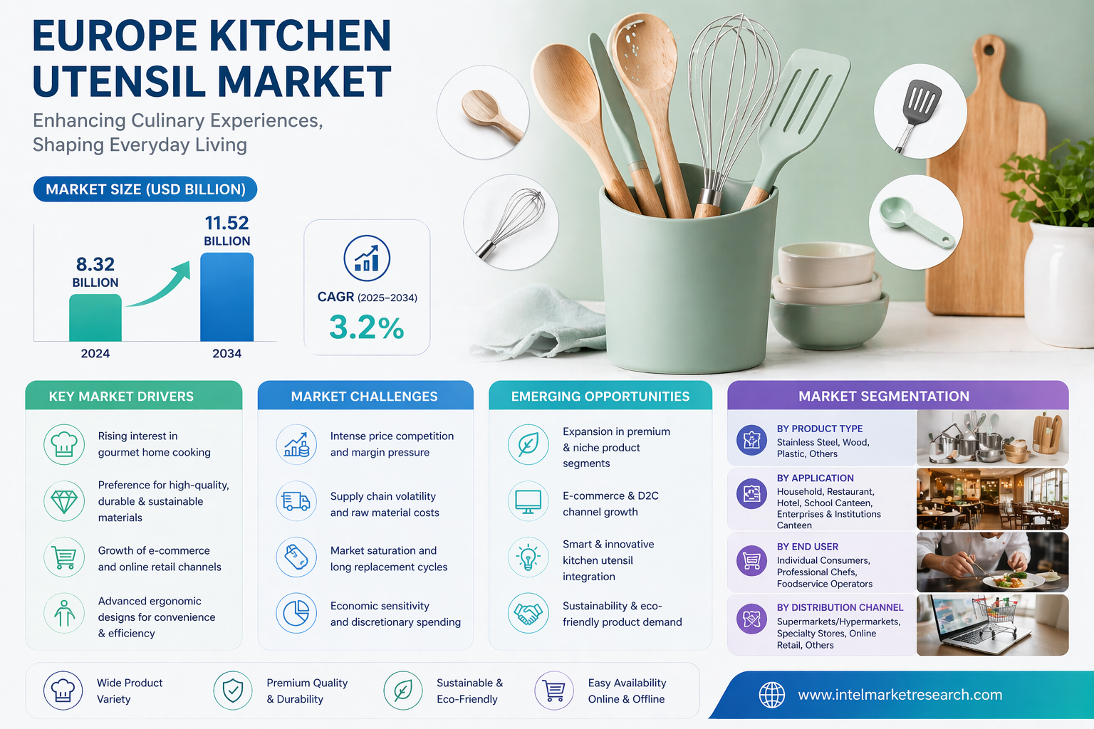 According to a new report from Intel Market Research, the Europe Kitchen Utensil market was valued at USD 8.32 billion in 2024 and is projected to reach USD 11.52 billion by 2034, growing at a CAGR of 3.2% during the forecast period (2025–2034). This growth is propelled by rising consumer interest in gourmet home cooking, a strong preference for high-quality, durable materials like premium stainless steel and sustainably sourced wood, integration of advanced ergonomic designs, and the rapid expansion of e-commerce channels.