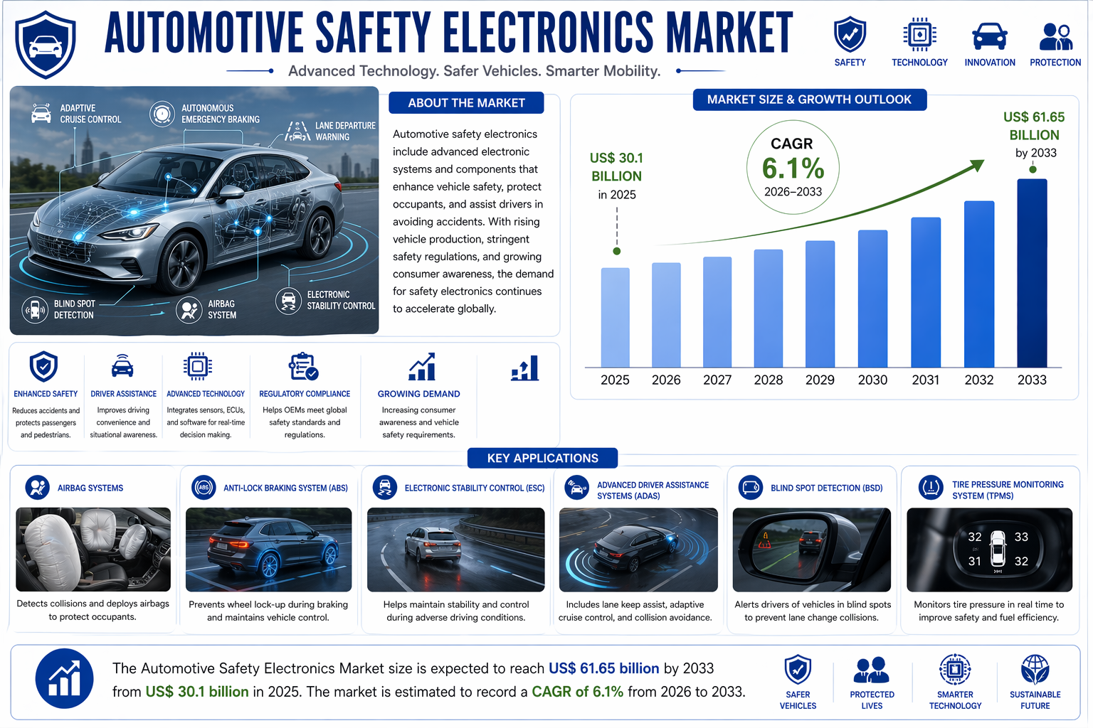 According to recent industry projections, the Automotive Safety Electronics market size is expected to reach US$ 61.65 billion by 2033 from US$ 30.1 billion in 2025. The market is estimated to record a CAGR of 6.1% from 2026 to 2033. This steady growth is fueled by stringent government mandates regarding vehicle safety, an increasing consumer preference for high tech safety features, and the rapid electrification of the global automotive fleet. As manufacturers strive to achieve "Vision Zero" a future with no traffic related fatalities the demand for sophisticated safety electronics continues to skyrocket.