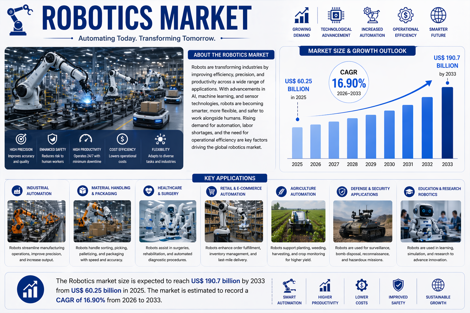 The financial trajectory of this industry reflects its vital importance to global infrastructure. According to the latest market data, the Robotics market size is expected to reach US$ 190.7 billion by 2033 from US$ 60.25 billion in 2025. The market is estimated to record a CAGR of 16.90% from 2026 to 2033. This double digit growth rate is supported by the increasing "cobotization" of the workplace. Unlike traditional industrial robots that require safety cages, collaborative robots are designed to work alongside humans safely. This segment is expected to outpace traditional robotics growth as sectors like electronics assembly and pharmaceuticals adopt these agile solutions to enhance human productivity rather than replace it entirely.