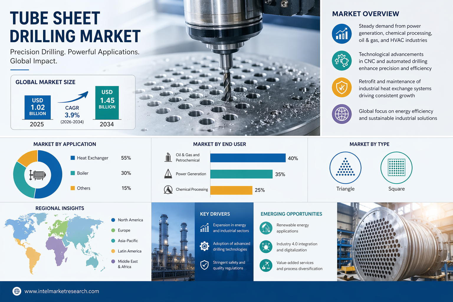 According to a new report from Intel Market Research, the global Tube Sheet Drilling market was valued at USD 1.02 billion in 2025 and is projected to reach USD 1.45 billion by 2034, growing at a CAGR of 3.9% during the forecast period (2026–2034). This growth is propelled by sustained demand from key end-use industries such as power generation, chemical processing, oil & gas, and HVAC, alongside the global push for energy efficiency and the subsequent retrofit and maintenance of existing industrial heat exchange systems.