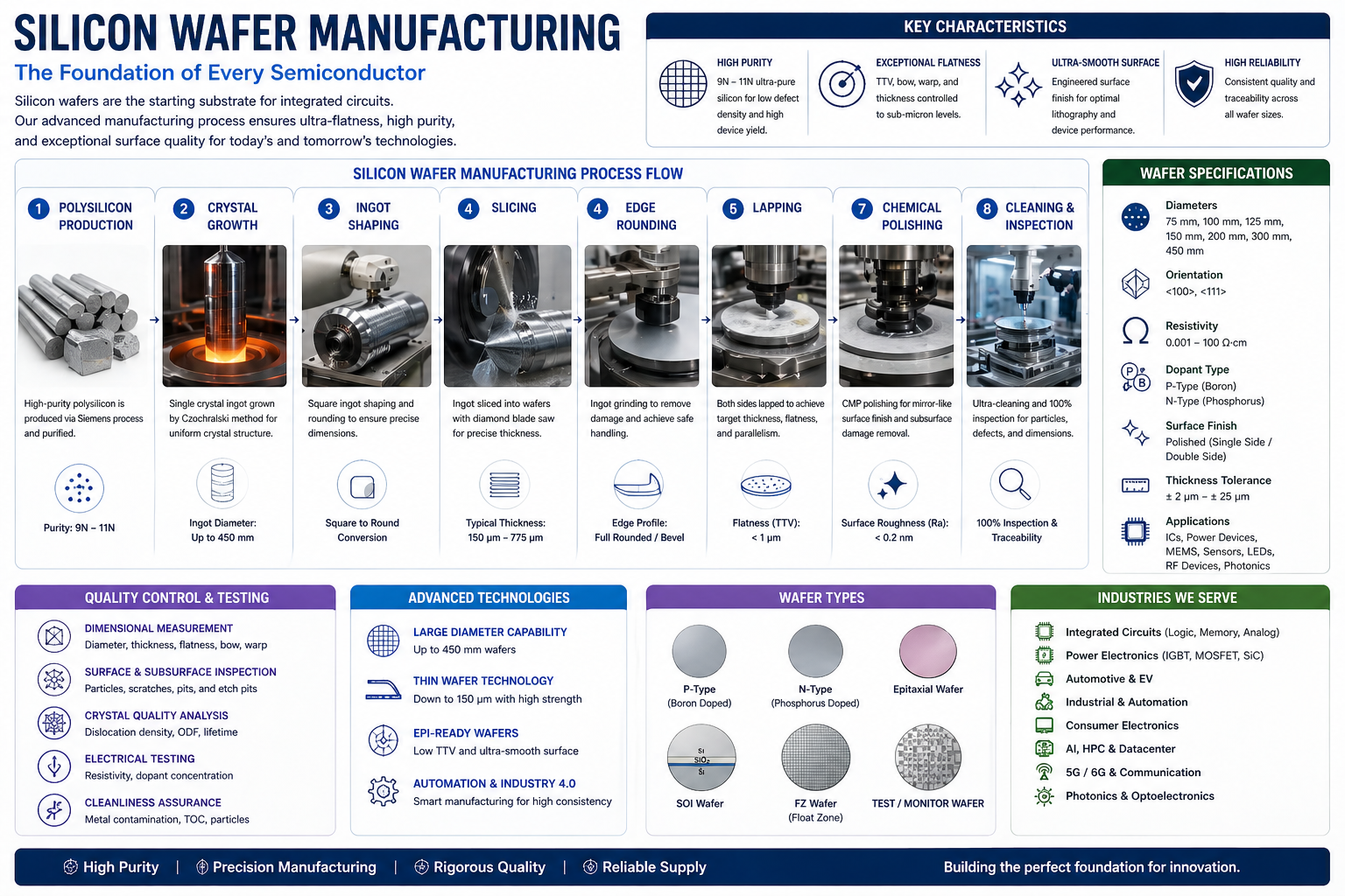 • Why is it so risky for a foundry to switch wafer suppliers? Each supplier's wafers are slightly different; switching requires recalibrating millions of dollars of equipment and potentially re-testing the entire chip design, which takes months.