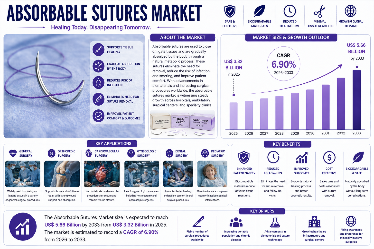 The global healthcare landscape is witnessing a significant transformation, driven by advancements in surgical techniques and a rising emphasis on post-operative recovery. Central to this evolution is the absorbable sutures market, which plays a critical role in wound management across various medical specialties. Absorbable sutures are temporary wound closure devices designed to degrade naturally within the body through processes like hydrolysis or enzymatic digestion. This eliminates the need for a secondary procedure to remove stitches, thereby reducing patient discomfort and the risk of infection.