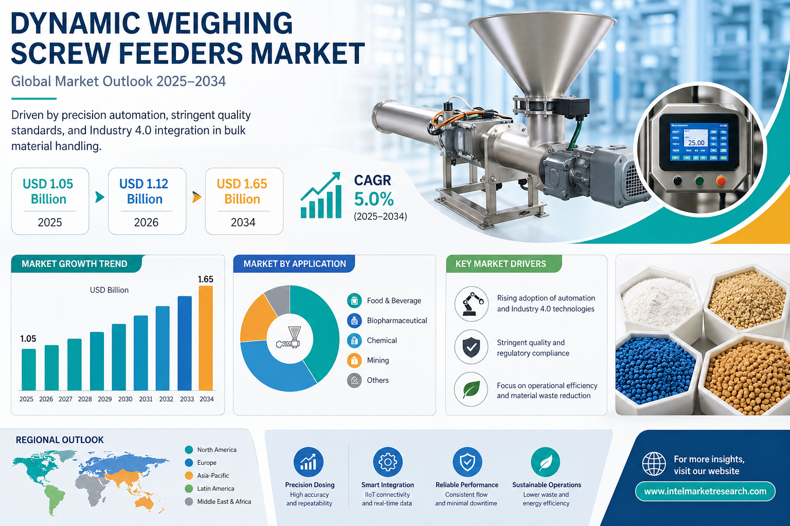 According to a new report from Intel Market Research, the global Dynamic Weighing Screw Feeders market was valued at USD 1.05 billion in 2025 and is projected to grow from USD 1.12 billion in 2026 to USD 1.65 billion by 2034, exhibiting a robust CAGR of 5.0% during the forecast period (2025–2034). This steady expansion is driven by escalating demand for precision automation across process-intensive industries, stringent quality compliance requirements, and the accelerating integration of Industry 4.0 technologies into bulk material handling operations.