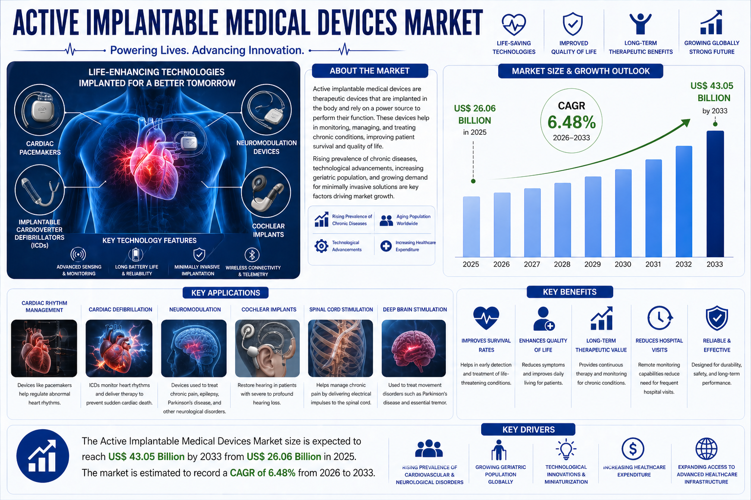 The financial outlook for the industry remains highly positive as investment in healthcare infrastructure continues to rise globally. The Active Implantable Medical Devices Market size is expected to reach US$ 43.05 Billion by 2033 from US$ 26.06 Billion in 2025. The market is estimated to record a CAGR of 6.48% from 2026 to 2033.
