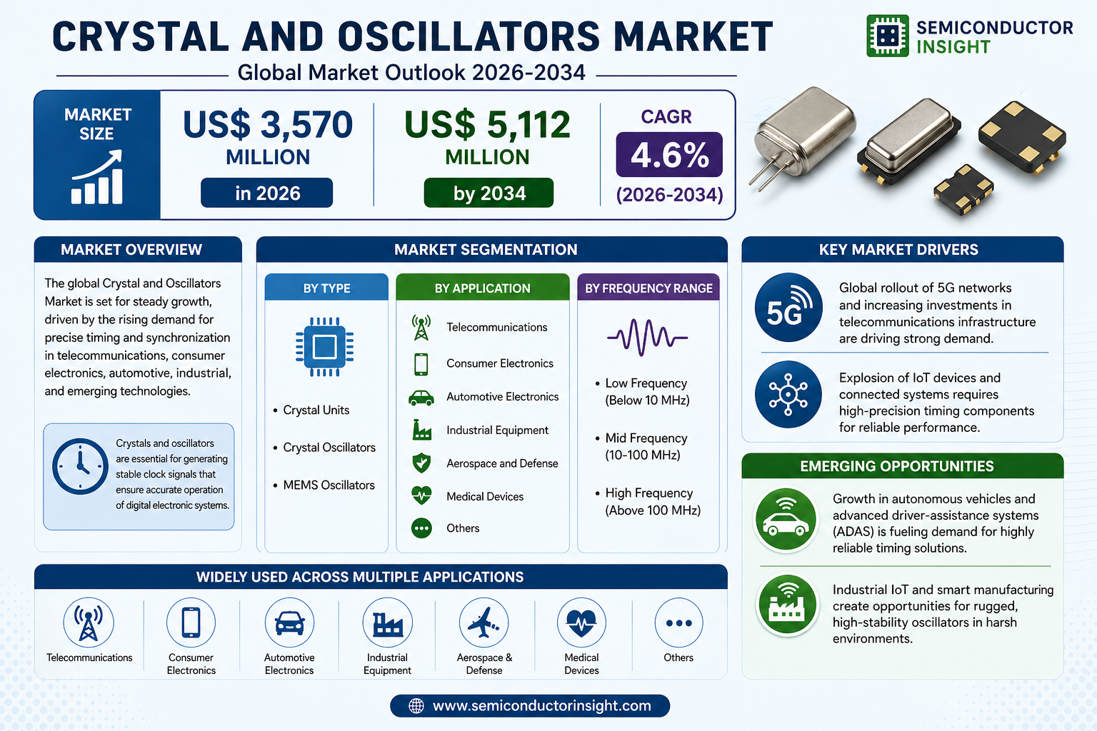 The report identifies the global rollout of 5G networks and the explosive growth of Internet of Things (IoT) devices as the paramount drivers for crystal and oscillator demand. The telecommunications segment accounts for approximately 32% of total market application, with this share expected to grow as 5G deployment accelerates worldwide. The global 5G infrastructure market itself is projected to exceed $100 billion annually by 2026, creating substantial demand for timing components in base stations and network equipment.
