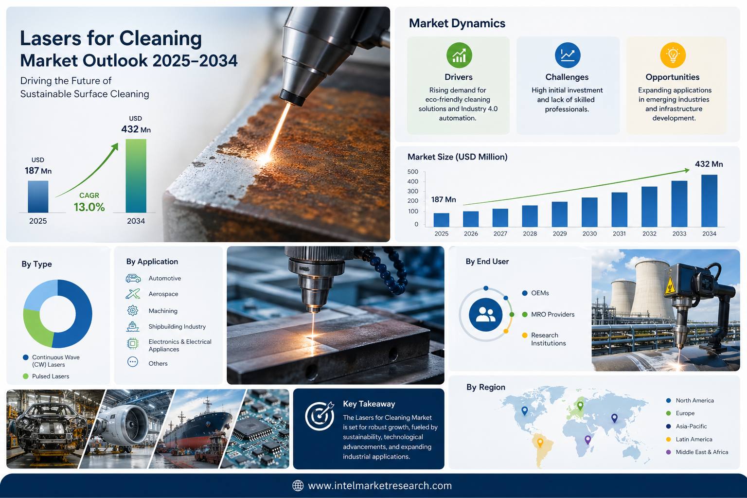 According to a new report from Intel Market Research, the global Lasers for Cleaning market was valued at USD 187 million in 2025 and is projected to reach USD 432 million by 2034, growing at a robust CAGR of 13.0% during the forecast period (2025–2034). This growth is propelled by the push towards Industry 4.0 automation in surface preparation, rising demand for eco-friendly alternatives to chemical solvents and abrasive methods, and strong contributions from the automotive sector for treating composite parts before bonding.