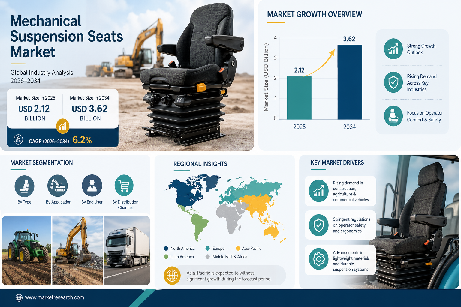 According to a new report from Intel Market Research, the global Mechanical Suspension Seats market was valued at USD 2.12 billion in 2025 and is projected to reach USD 3.62 billion by 2034, growing at a CAGR of 6.2% during the forecast period (2026–2034). This growth is propelled by rising demand from agricultural machinery, construction equipment, and commercial vehicles, coupled with stringent regulations on operator safety and ergonomics, and advancements in lightweight materials and durable suspension mechanisms.