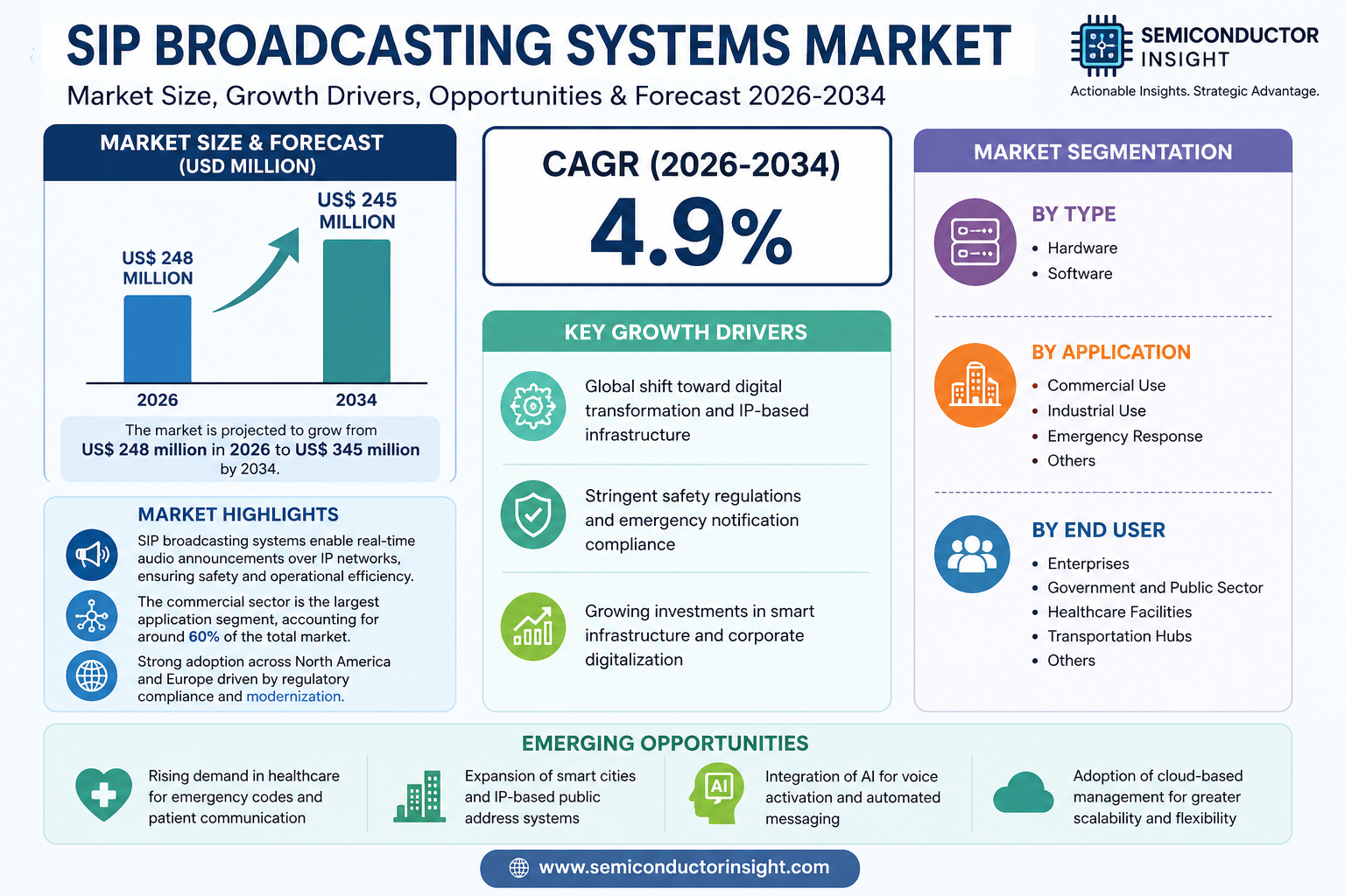 Global SIP Broadcasting Systems Market, valued at US$ 248 million in 2024, is poised for steady growth, projected to reach US$ 345 million by 2032. This expansion, representing a compound annual growth rate (CAGR) of 4.9%, is detailed in a comprehensive new report published by Semiconductor Insight. The study underscores the critical role of these IP-based audio communication solutions in modernizing public address and mass notification systems across various sectors.