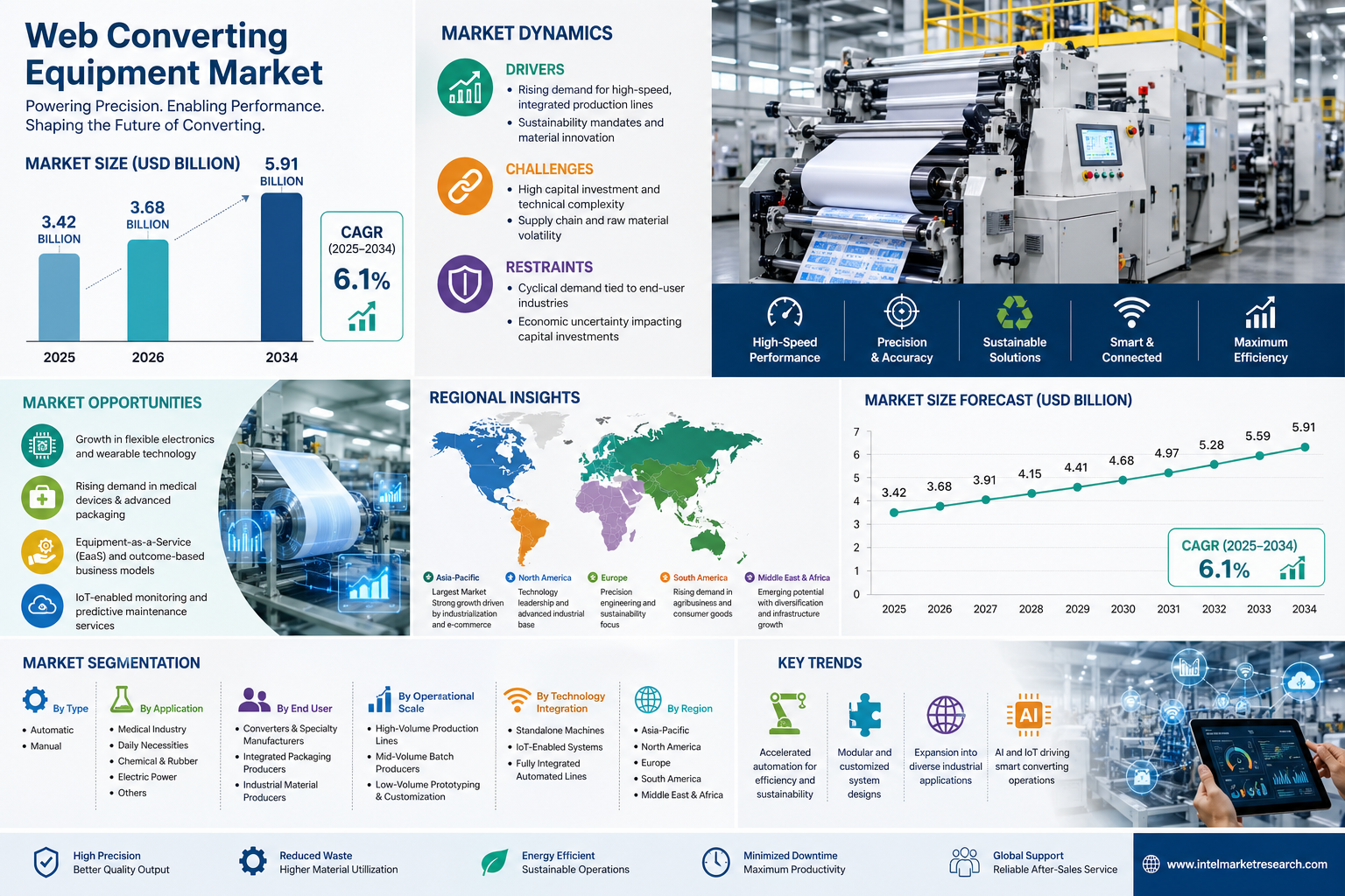 According to a new report from Intel Market Research, the global Web Converting Equipment market was valued at USD 3.42 billion in 2025 and is projected to grow from USD 3.68 billion in 2026 to USD 5.91 billion by 2034, exhibiting a robust CAGR of 6.1% during the forecast period (2025–2034). This growth is propelled by escalating demand for efficient packaging solutions, accelerating Industry 4.0 adoption, and the increasing need for precision material processing across food & beverage, pharmaceutical, and flexible electronics sectors.
