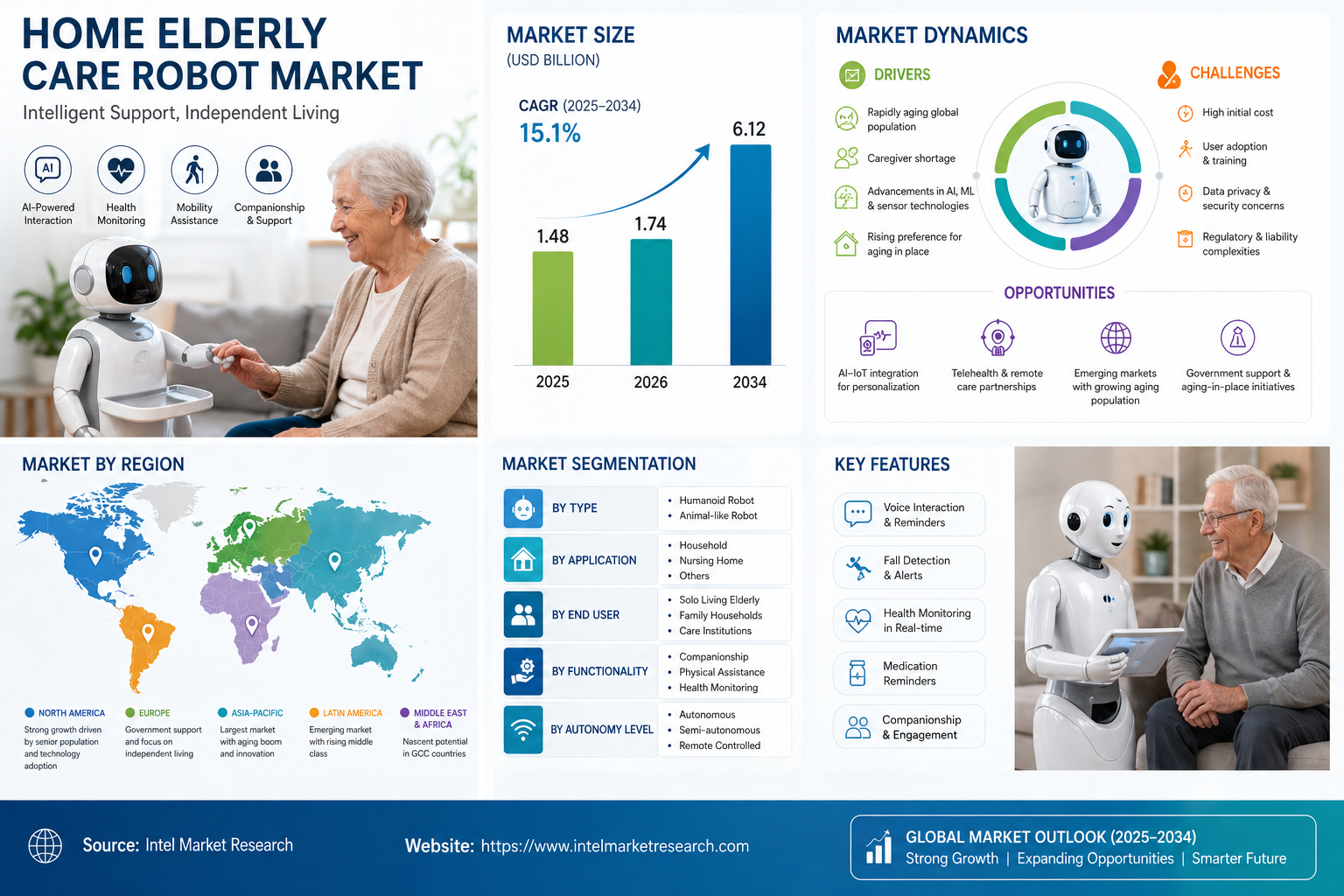 According to a new report from Intel Market Research, the global Home Elderly Care Robot market was valued at USD 1.48 billion in 2025 and is projected to grow from USD 1.74 billion in 2026 to reach USD 6.12 billion by 2034, exhibiting a robust CAGR of 15.1% during the forecast period (2025–2034). This growth is driven by the rapid global aging of populations, a widening gap in professional caregiver availability, and significant advancements in artificial intelligence, machine learning, and sensor technologies.
