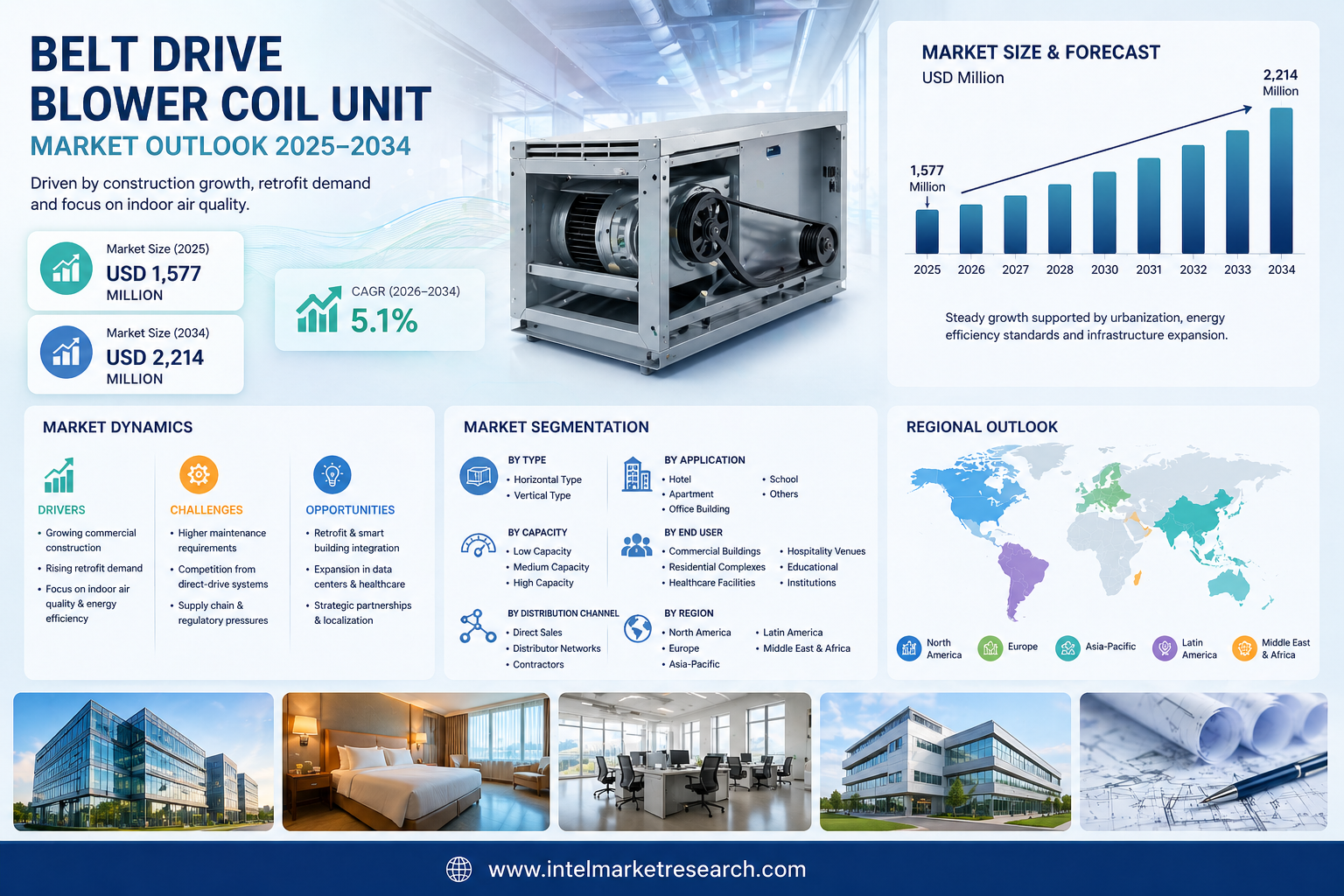 According to a new report from Intel Market Research, the global Belt Drive Blower Coil Unit market was valued at USD 1,577 million in 2025 and is projected to reach USD 2,214 million by 2034, growing at a CAGR of 5.1% during the forecast period (2026–2034). This growth is propelled by expanding construction activity in commercial real estate, increasing retrofit demand in aging building infrastructure, and heightened awareness around indoor air quality standards.