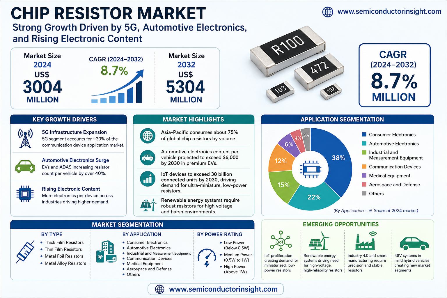 Global Chip Resistor Market, valued at US$ 3004 million in 2024, is poised for substantial growth, projected to reach US$ 5304 million by 2032. This expansion, representing a compound annual growth rate (CAGR) of 8.7%, is detailed in a comprehensive new report published by Semiconductor Insight. The study underscores the indispensable role these fundamental passive components play in virtually all electronic circuits, from consumer gadgets to mission-critical automotive and industrial systems.
