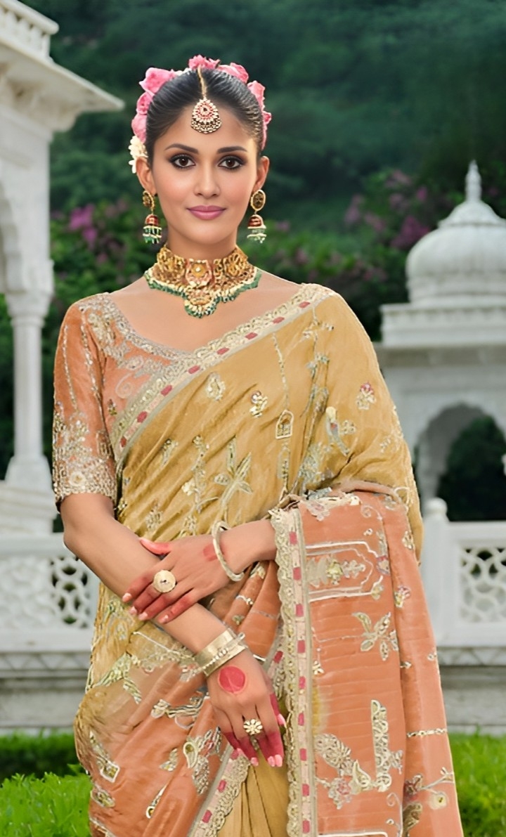 Organza sarees are like poetry in motion, light, sheer, and delicately structured. They often come with floral prints, minimal embroidery, or pastel tones.