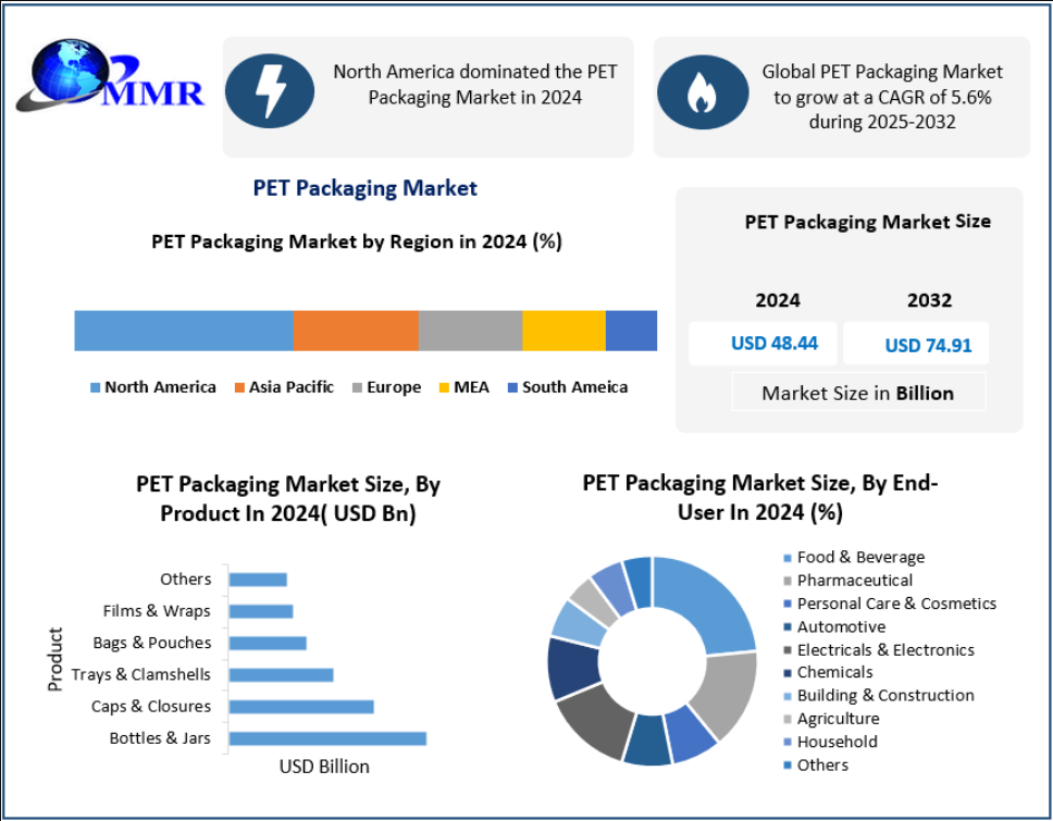 The PET Packaging Market, valued at USD 48.44 billion in 2024, is entering a transformative growth phase driven by sustainability imperatives, rapid technological advancement, and rising consumption across food, beverage, pharmaceutical, and personal care sectors. With an anticipated CAGR of 5.6% from 2025 to 2032, the market is projected to reach USD 74.91 billion by 2032, reflecting accelerating global demand for lightweight, recyclable, and cost-effective packaging materials.
