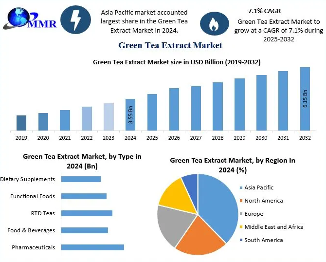 The global Green Tea Extract Market is witnessing significant growth, driven by rising health consciousness, increasing demand for natural ingredients, and growing adoption of functional foods and beverages. The market was valued at around USD 3.55 billion in 2024 and is projected to reach nearly USD 6.15 billion by 2032, registering a CAGR of approximately 7.1% during the forecast period. Green tea extract, rich in potent bioactive compounds such as catechins and EGCG, has become a preferred ingredient in modern wellness products due to its antioxidant, metabolic, and therapeutic properties. The shift toward preventive healthcare, clean-label products, and plant-based formulations continues to be a major catalyst for market expansion.