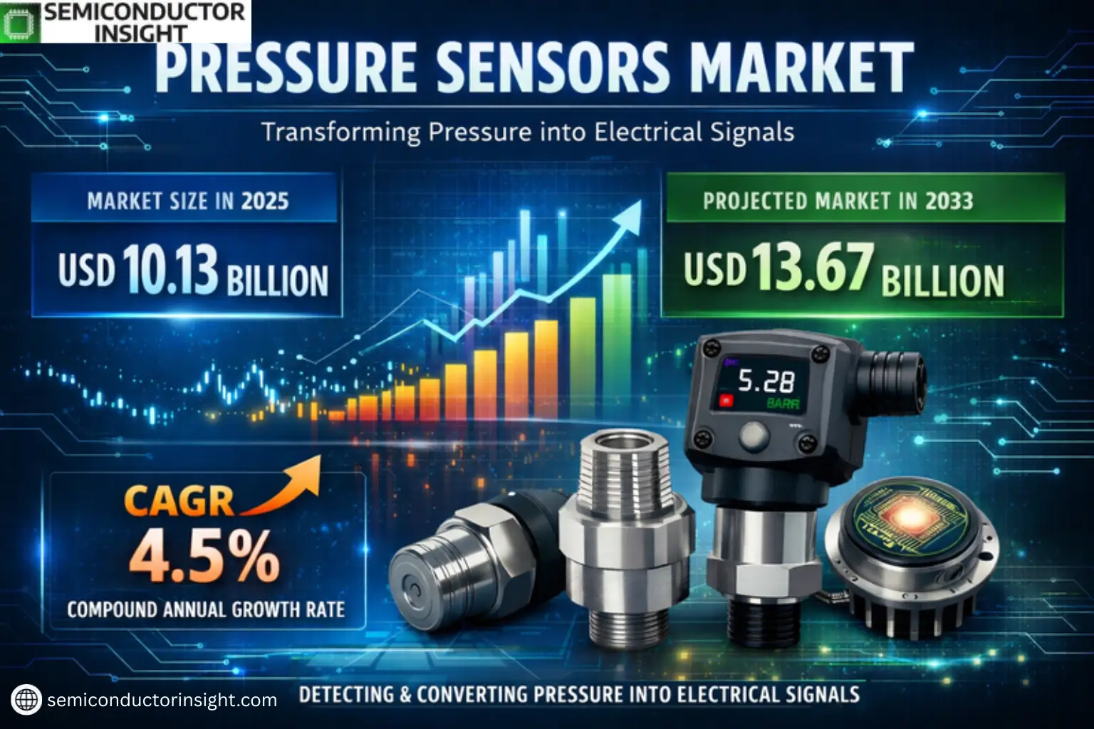 Global Pressure Sensors Market was valued at USD 10.13 billion in 2025 and is projected to reach USD 13.67 billion by 2033, registering a CAGR of 4.5% during the forecast period 2026–2034. Growth remains steady, supported by expanding automotive safety integration and Industry 4.0-driven automation upgrades worldwide.