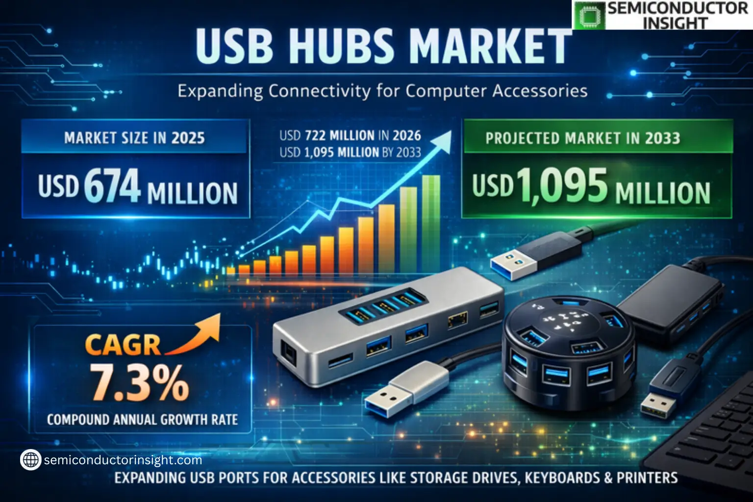 Global USB Hubs Market was valued at USD 674 million in 2025 and is projected to reach USD 1,095 million by 2034, exhibiting a CAGR of 7.3% during the forecast period 2026–2034. The market is expanding steadily as smart device proliferation and compact computing trends increase demand for high-speed, multi-port connectivity solutions.
