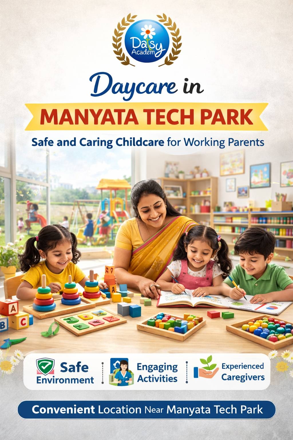 One of the biggest advantages of choosing Daisy Montessori School is its convenient location. Parents working around Manyata Tech Park can easily manage their work schedule while ensuring their child is in a safe and nurturing environment.