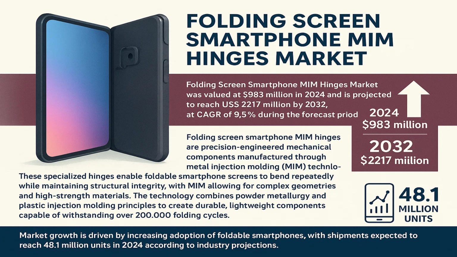Global Folding Screen Smartphone MIM Hinges Market was valued at USD 983 million in 2024 and is projected to reach USD 2.22 billion by 2032, registering a CAGR of 9.5% during the forecast period 2025–2032. Market expansion is closely tied to the rapid growth of foldable smartphones, increasing demand for advanced hinge durability, and continuous innovation in metal injection molding (MIM) technology for precision mechanical components.