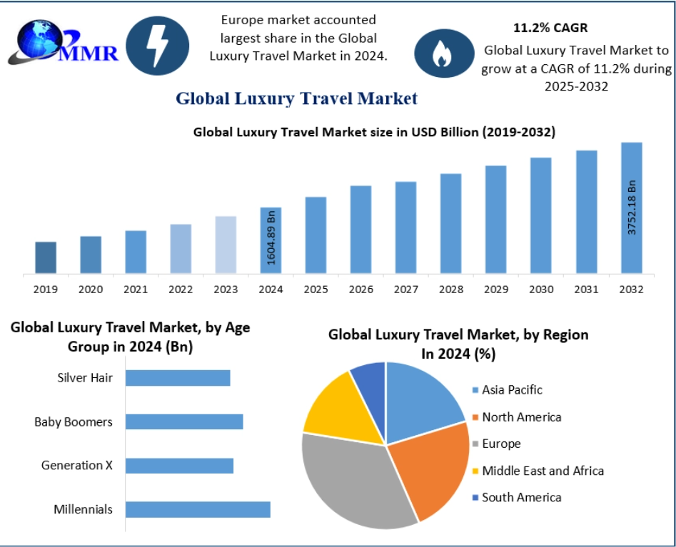 The Luxury Travel Market was valued at USD 1,604.89 billion in 2024 and is projected to grow at a robust CAGR of 11.2% between 2025 and 2032, reaching approximately USD 3,752.18 billion by 2032. This rapid expansion reflects the growing global appetite for premium, personalized, and experience-driven travel offerings.