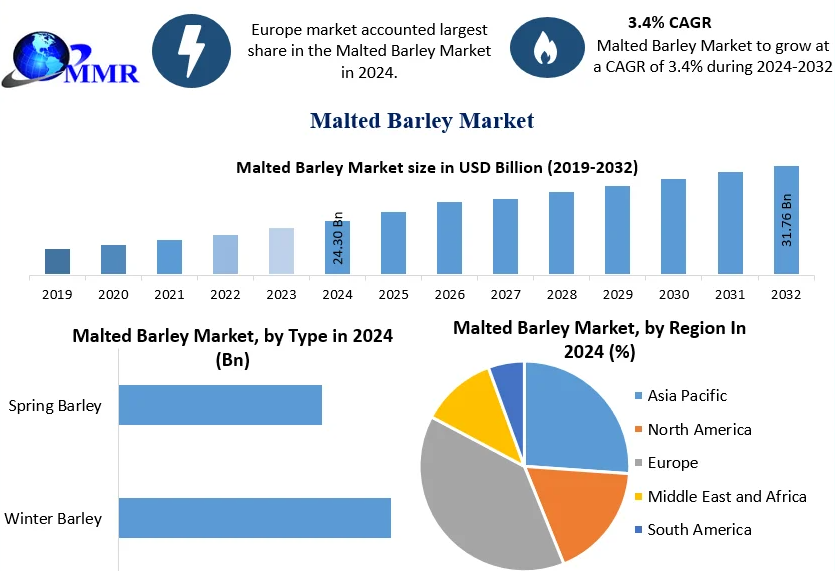 The Global Malted Barley Market continues to demonstrate resilience and growth momentum as demand expands across alcoholic and non‑alcoholic beverage sectors as well as food applications. Valued at USD 24.30 billion in 2024, the market is projected to reach approximately USD 31.76 billion by 2032, growing at a CAGR of 3.4 % over the forecast period 2025–2032.