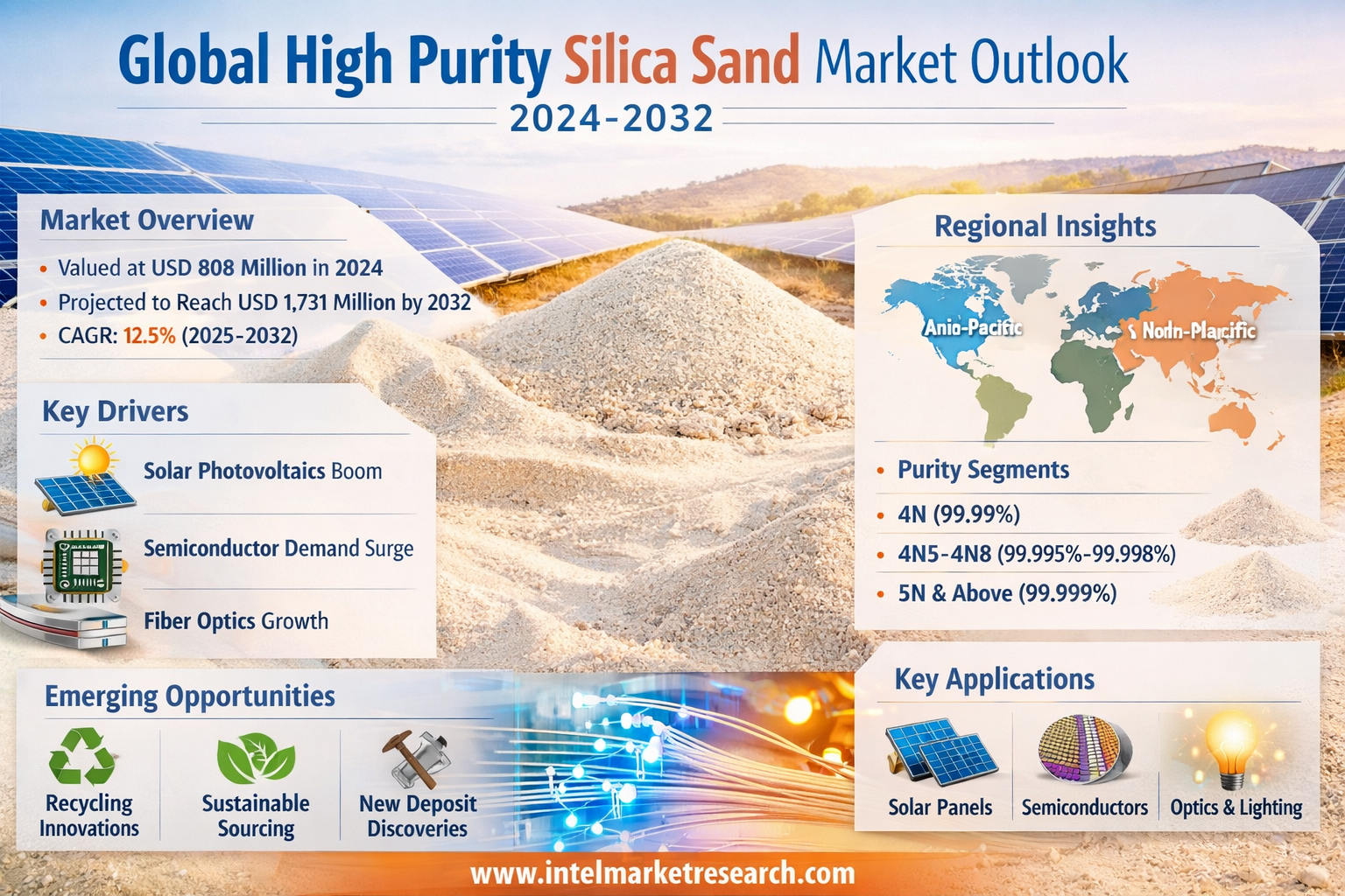 According to a new report from Intel Market Research, the global High Purity Silica Sand market was valued at USD 808 million in 2024 and is projected to reach USD 1,731 million by 2032, growing at a robust CAGR of 12.5% during the forecast period (2025-2032). This growth is fueled by surging demand from solar photovoltaic manufacturing and semiconductor industries, particularly in Asia-Pacific markets.
