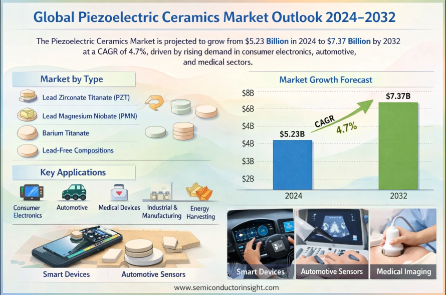 Global Piezoelectric Ceramics Market, valued at $5.23 billion in 2024, is projected to reach $7.37 billion by 2032, growing at a compound annual growth rate (CAGR) of 4.7% during the forecast period. This steady expansion is detailed in a comprehensive new report published by Semiconductor Insight, highlighting the indispensable role of these advanced materials in converting mechanical energy into electrical signals and vice versa across numerous high-tech industries.