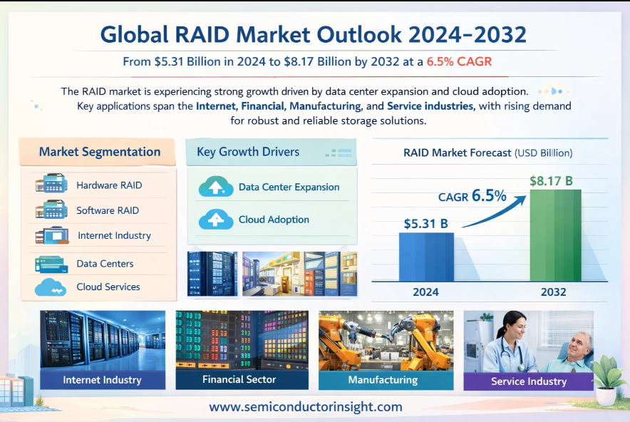 Global Redundant Array of Independent Disks (RAID) Market, valued at a robust US$ 5,311 million in 2024, is on a trajectory of steady expansion, projected to reach US$ 8,166 million by 2032. This growth, representing a compound annual growth rate (CAGR) of 6.5%, is detailed in a comprehensive new report published by Semiconductor Insight. The study highlights the indispensable role of RAID technology in ensuring data integrity, availability, and performance across enterprise storage, data centers, and cloud infrastructure.