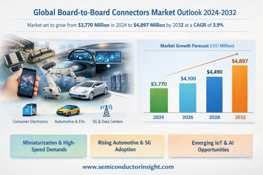 Global Board-to-Board Connectors Market, valued at a robust US$ 3,770 million in 2024, is on a trajectory of steady expansion, projected to reach US$ 4,897 million by 2032. This growth, representing a compound annual growth rate (CAGR) of 3.9%, is detailed in a comprehensive new report published by Semiconductor Insight. The study highlights the indispensable role these precision components play in enabling high-density interconnections across a vast spectrum of modern electronic devices, from smartphones and laptops to advanced automotive systems and industrial automation equipment.