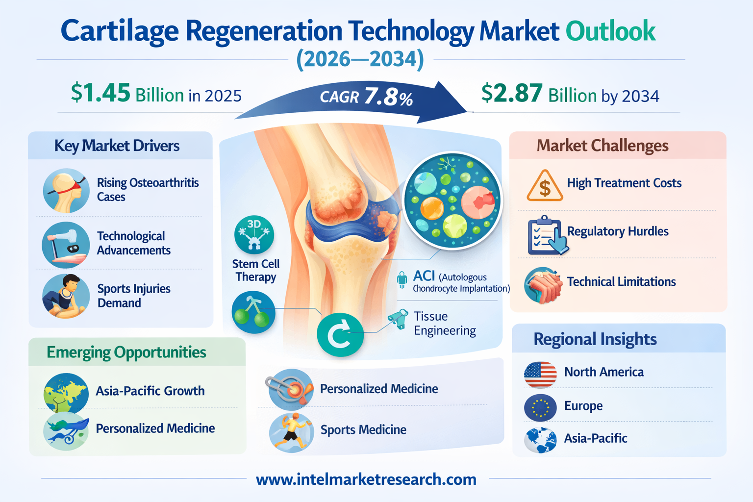 According to new analysis from Intel Market Research, the global Cartilage Regeneration Technology market was valued at USD 1.45 billion in 2025 and is projected to reach USD 2.87 billion by 2034, growing at a steady CAGR of 7.8% during the forecast period (2026–2034). This expansion is fueled by the rising global burden of orthopedic conditions, increasing sports-related injuries, and technological breakthroughs in regenerative medicine.