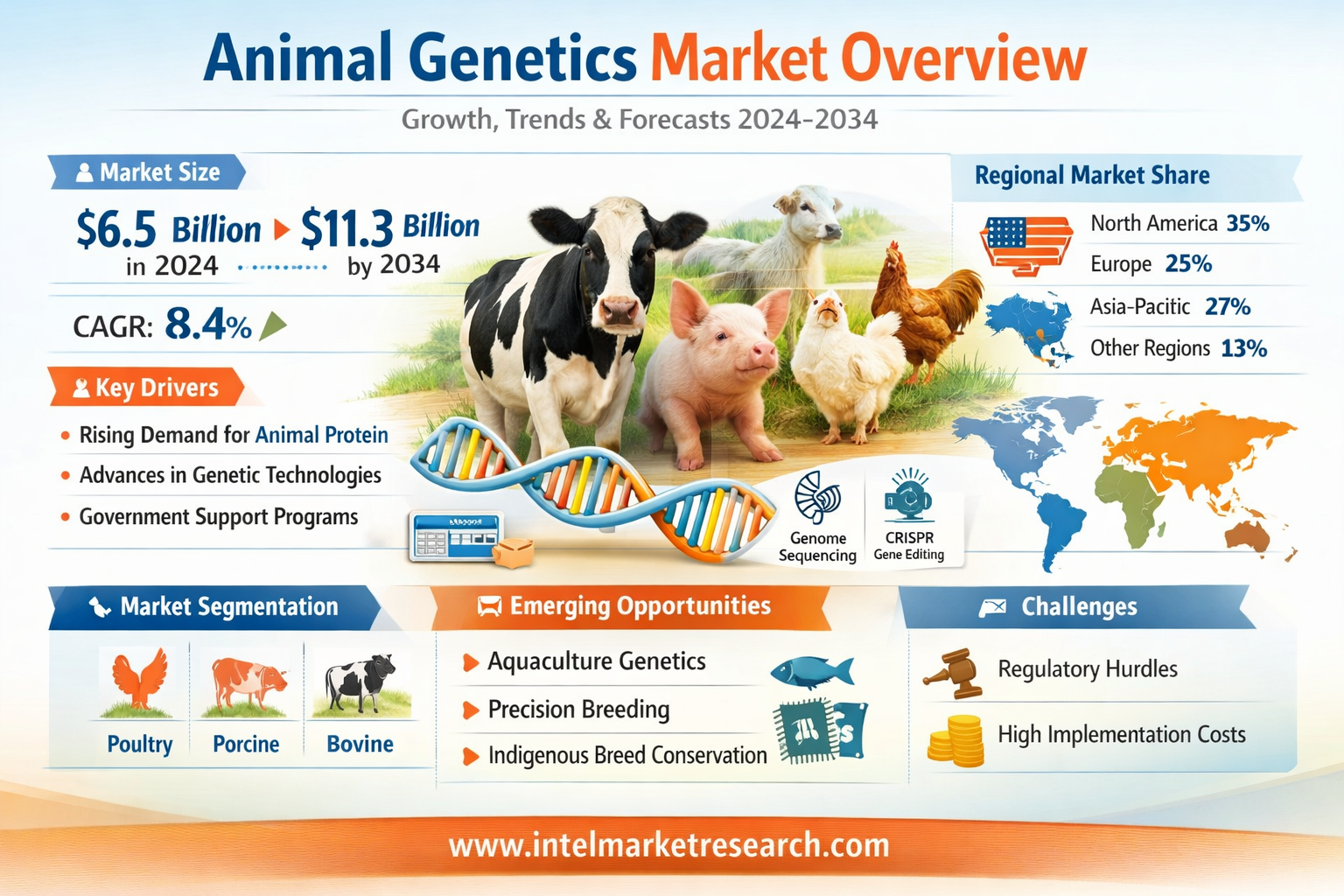 According to a new report from Intel Market Research, the global Animal Genetics market was valued at USD 6.5 billion in 2024 and is projected to reach USD 11.3 billion by 2034, growing at a CAGR of 8.4% during the forecast period. This growth is driven by increasing demand for high-quality animal protein, advancements in genetic technologies, and the need for improved livestock productivity across global food systems.
