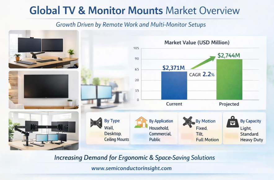 Global TV & Monitor Mounts Market, valued at a robust US$ 2,371 million in 2024, is set for steady growth, projected to reach US$ 2,744 million by 2032. This expansion, representing a compound annual growth rate (CAGR) of 2.2%, is detailed in a comprehensive new report published by Semiconductor Insight. The study underscores the critical role of these mounting solutions in enhancing viewing experiences, optimizing workspace ergonomics, and enabling modern interior design across residential, commercial, and public environments.
