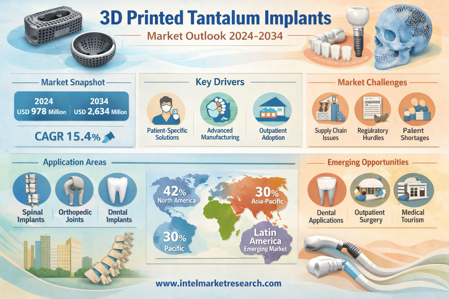 According to a new report from Intel Market Research, the global 3D Printed Tantalum Implants market was valued at USD 978 million in 2024 and is projected to reach USD 2,634 million by 2034, growing at a robust CAGR of 15.4% during the forecast period (2025–2034). This remarkable growth trajectory underscores how additive manufacturing is revolutionizing orthopedic and dental implant solutions through tantalum's unique properties.