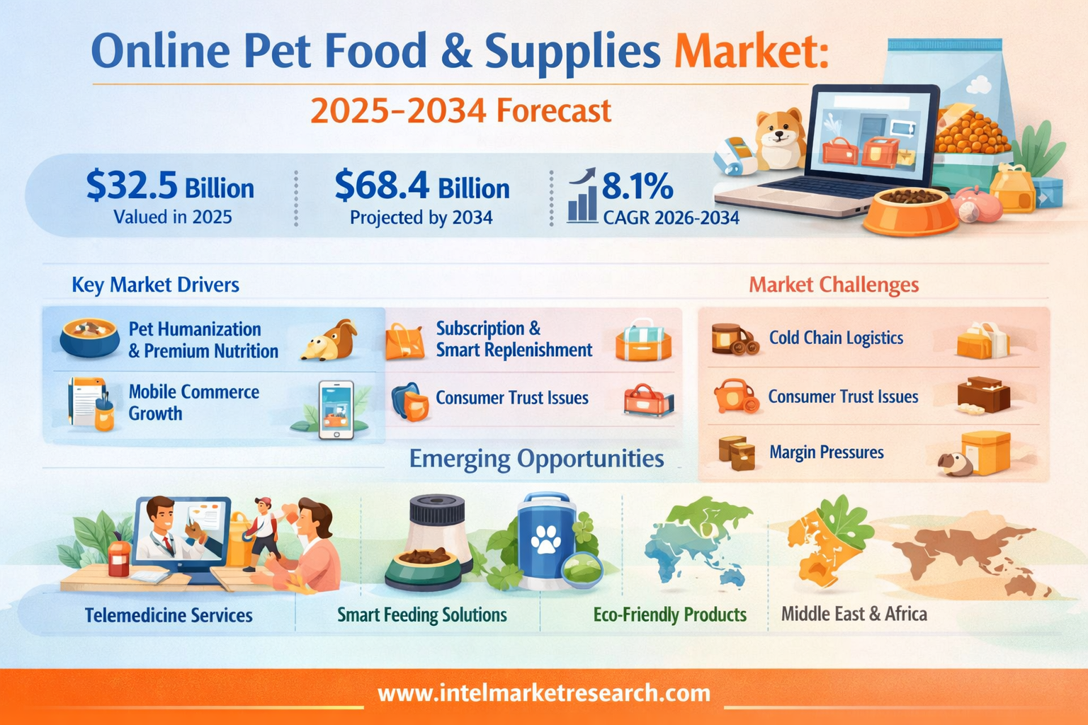 According to a new report from Intel Market Research, the global Online Pet Food and Supplies market was valued at USD 32.5 billion in 2025 and is projected to reach USD 68.4 billion by 2034, growing at a CAGR of 8.1% during the forecast period (2026-2034). This sustained growth reflects the accelerating shift toward e-commerce in the pet care sector, combined with evolving consumer preferences for premium pet nutrition and convenience-driven purchasing models.